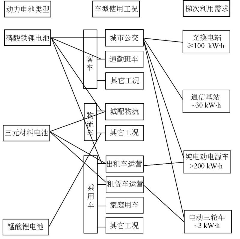 我國動力電池主要搭載使用的車型有商用車(客車、專用車)和乘用車,其中專用車主要為城市電動物流車。車型不同、使用工況和環(huán)境不同,退役時動力電池的安全性和性能有所不同。過充過放、環(huán)境溫度、機(jī)械濫用(針刺、擠壓、內(nèi)短路)以及海水浸泡等濫用,都對退役后的電池安全性有影響[42]。此外,還需考慮我國各類新能源汽車的應(yīng)用領(lǐng)域、運(yùn)營模式等,對電池退役后再利用的影響。