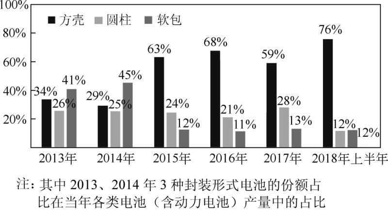 圖3 2013—2018年上半年我國三種封裝形式動力電池裝機(jī)量占比