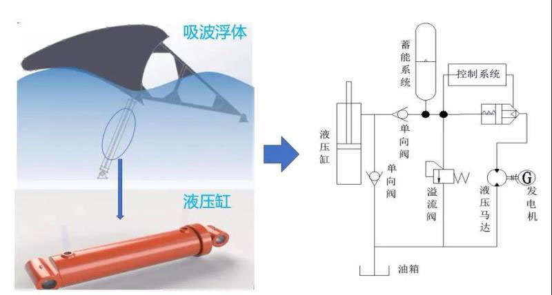 能量轉(zhuǎn)換系統(tǒng)包括二級能量轉(zhuǎn)換系統(tǒng)和三級能量轉(zhuǎn)換系統(tǒng)。鷹式波浪能裝置的二級能量轉(zhuǎn)換系統(tǒng)采用液壓系統(tǒng)(主要由液壓轉(zhuǎn)換系統(tǒng)、蓄能穩(wěn)壓系統(tǒng)、液壓自治控制系統(tǒng)組成),將浮子的往復(fù)機(jī)械能轉(zhuǎn)換為液壓能,再轉(zhuǎn)換為發(fā)電機(jī)的旋轉(zhuǎn)機(jī)械能。三級能量轉(zhuǎn)換系統(tǒng)(即發(fā)電系統(tǒng))由馬達(dá)、發(fā)電機(jī)、變換電路、負(fù)載組成。液壓轉(zhuǎn)換系統(tǒng)的核心元件通常采用液壓缸,鷹式“舟山號”波浪能裝置采用雙出桿的液壓缸,安裝在吸波浮體與半潛船體之間。