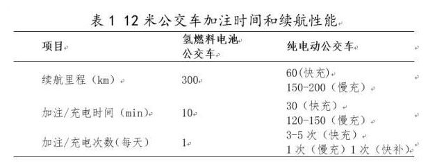 以12米公交車實際運行的數(shù)據(jù)為例,加注/充電時間和續(xù)航性能對比如表1所示。