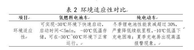 氫燃料電池車與純電動車的環(huán)境適應(yīng)性對比如表2所示。