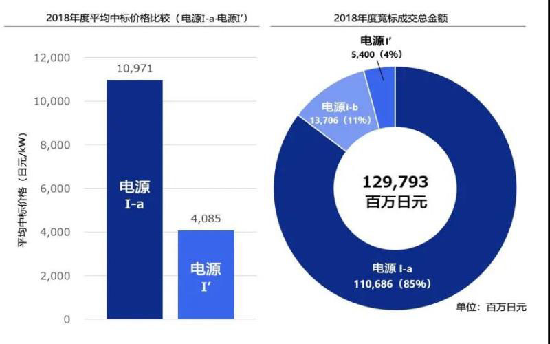 2017年度系統(tǒng)運營商調(diào)節(jié)電源首次實行公開競價招標,電源Ⅰ'中標容量合計為132萬千瓦,其中DR資源中標容量為95.8萬千瓦,遠高于發(fā)電廠中標容量36.1萬千瓦,DR資源平均中標價格為3609日元/千瓦,遠低于發(fā)電廠的5210日元/千瓦,DR協(xié)議總價為35.93億日元。如圖3所示,2018年度電源Ⅰ交易總額為1297.93億日元,其中Ⅰ-a占85%,Ⅰ-b占11%,Ⅰ'僅占4%。受響應(yīng)速度影響,DR資源目前還參與不了Ⅰ-a市場的競爭,Ⅰ-a中標價格為10971日元/千瓦,而Ⅰ'中標價格不足一半,僅為4085日元/千瓦。電源Ⅰ'中標容量的DR資源為96.1萬千瓦,約占全部的70%左右,協(xié)議總價約36億日元。從最新完成的2020年度競標情況來看,盡管DR參與電源Ⅰ'中標容量為128.9萬千瓦,DR平均中標價格升到5916日元/千瓦,協(xié)議總價也翻番達到66億日元,但DR所占份額則大幅下降。總體來說,DR資源平均占電源Ⅰ'中標容量的一半以上,DR平均中標價格約低于發(fā)電廠的30%左右。