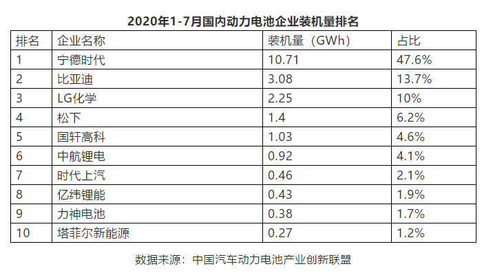 中國汽車動力電池產(chǎn)業(yè)創(chuàng)新聯(lián)盟數(shù)據(jù)顯示,在2020年1-7月國內(nèi)帶來的企業(yè)裝機量排名中,LG化學和松下分列三、四名,僅次于寧德時代和比亞迪。