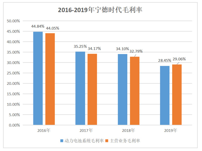 寧德時代IPO前的招股書和年報披露的數(shù)據(jù)顯示,從2016年到2019年,其動力電池系統(tǒng)業(yè)務(wù)毛利率和主營業(yè)務(wù)毛利率處于持續(xù)下滑狀態(tài),動力電池系統(tǒng)業(yè)務(wù)毛利率從2016年的44.84%降至2019年的28.45%,主營業(yè)務(wù)毛利率從2016年的44.05%降至2019年的29.06%。