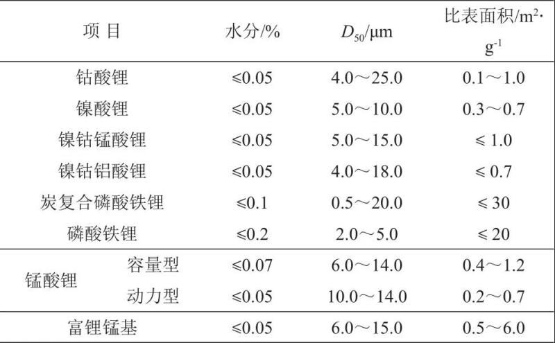 表9 正極材料標(biāo)準(zhǔn)中水分含量要求
