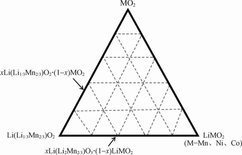 富鋰錳基材料(簡(jiǎn)稱Li-rich,OLO)是由美國(guó)阿貢實(shí)驗(yàn)室 THACKERAY小組于2001年系統(tǒng)研究并申請(qǐng)專利的正極材料,是由Li2MnO3和LiMO2構(gòu)成的固溶體。與NCM類似,由于其M的多變性和Li2MnO3、LiMO2兩種組成的變化(圖3),導(dǎo)致其主元素含量無(wú)法準(zhǔn)確定位,只能采用很寬的范圍界定,從而也削弱了制定該標(biāo)準(zhǔn)的價(jià)值。該正極材料在實(shí)用性方面還面臨電性能不穩(wěn)定的挑戰(zhàn),沒(méi)有真正的產(chǎn)品推向市場(chǎng),因此標(biāo)準(zhǔn)制定有些過(guò)于 前瞻。