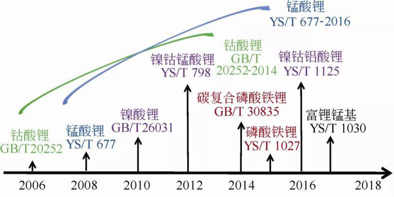 鋰離子電池正極材料在2000年前后開(kāi)始國(guó)產(chǎn)化,最初進(jìn)入市場(chǎng)應(yīng)用的主要是鈷酸鋰和少量的錳酸鋰,因此GB/T 20252—2006《鈷酸鋰》是全國(guó)有色金屬標(biāo)準(zhǔn)化技術(shù)委員會(huì)組織發(fā)布的第1個(gè)正極材料國(guó)家標(biāo)準(zhǔn)。之后,《錳酸鋰》、《鎳酸鋰》、《鎳鈷錳酸鋰》、《磷酸鐵鋰》、《鎳鈷鋁酸鋰》、《富鋰錳基》等國(guó)家或行業(yè)標(biāo)準(zhǔn)先后推出(圖2)。其中,《鈷酸鋰》和《錳酸鋰》分別于2014年和2016年進(jìn)行了標(biāo)準(zhǔn)修訂。
