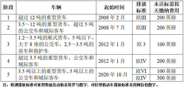 表 3 倫敦低排放區(qū)實(shí)施階段及排放標(biāo)準(zhǔn)[ 邱詩永,史歌,劉岱宗:城市低排放區(qū)國際案例研究,載《中國新能源汽車產(chǎn)業(yè)發(fā)展報(bào)告(2019)》,北京:社會科學(xué)文獻(xiàn)出版社,第429頁。]