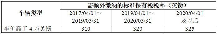 表 1 2017年4月1日及以后注冊的單價(jià)超4萬英鎊的車輛需額外繳納的標(biāo)準(zhǔn)保有稅稅率