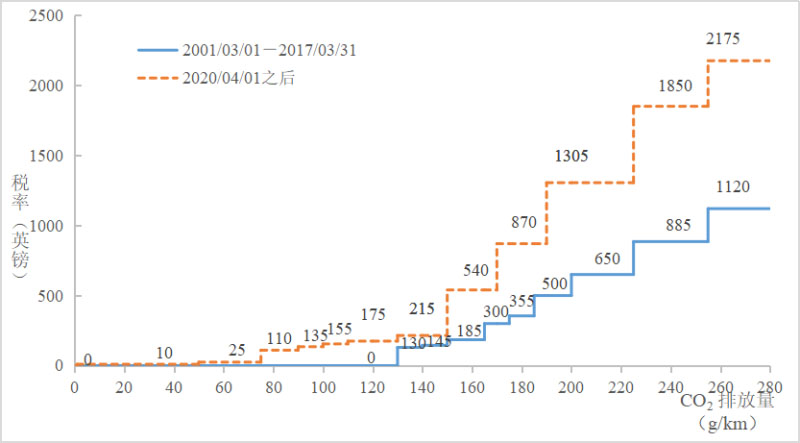 首次注冊稅,2001年3月1日至2017年3月31日,CO2排放量不高于130g/km的車輛免征,代用燃料汽車(含PHEV、HEV、CNGV)同排放量下首次注冊稅優(yōu)惠10英鎊;2017年4月1日及之后注冊的乘用車,僅零排放車輛免征首次注冊稅(最新稅額見圖 1)。