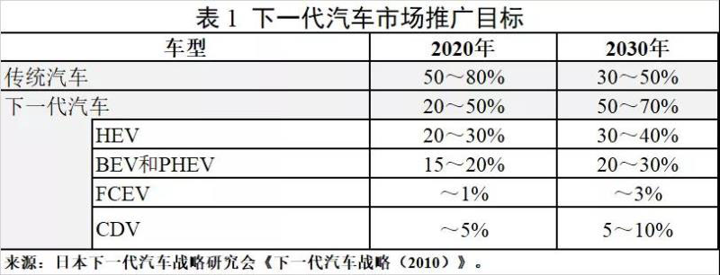 為降低汽車CO2排放并加強(qiáng)日本汽車工業(yè)的技術(shù)能力和競爭力,日本內(nèi)閣于2008年7月發(fā)布《創(chuàng)建低碳社會的行動計劃》,明確“下一代汽車”包括普通混合動力汽車(HEV)、純電動汽車(BEV)、插電式混合動力汽車(PHEV)、燃料電池汽車(FCEV)、清潔柴油汽車(CDV)、天然氣汽車(NGV)等車型,并提出力爭到2020年,下一代汽車在新車銷量中的占比達(dá)50%。2010年發(fā)布的《下一代汽車戰(zhàn)略(2010)》是對該文件的進(jìn)一步細(xì)化和落實(shí)。