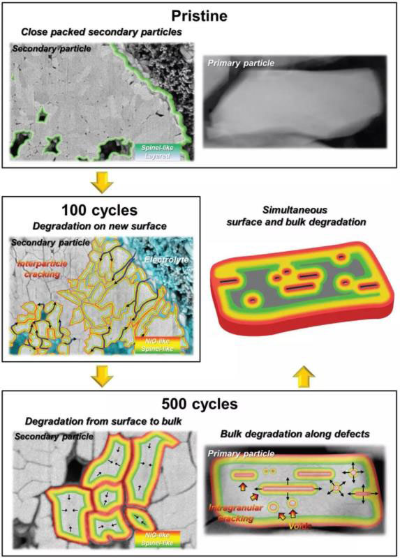 高Ni NCM電極結(jié)構(gòu)改變:二次NCM顆粒由密堆積的一次顆粒和缺陷組成,反復(fù)循環(huán)會(huì)引起一次顆粒之間的破裂,而新的一次顆粒之間的裸露裂紋和某些缺陷會(huì)導(dǎo)致電解液連續(xù)滲透。結(jié)果,由于一次顆粒中的裂紋或缺陷,降解從新暴露的表面繼續(xù)開(kāi)始,逐漸傳播并加速進(jìn)入一次顆粒中。最后,從一次粒子的表面以及二次粒子的表面開(kāi)始,高Ni NCM正極的降解會(huì)繼續(xù)進(jìn)行,并擴(kuò)散到大面積區(qū)域,導(dǎo)致整個(gè)電極的破壞。