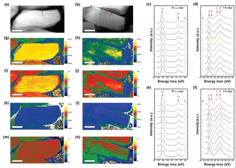 圖6. HAADF和EELS表征,能量散射強(qiáng)度圖(g, h)Ni M L3(i, j)Ni M L2峰/M L3峰強(qiáng)度比、(k, l)O K a、(m, n)O-K a峰和b峰強(qiáng)度比