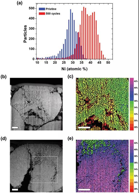 TEM表征樣品元素含量:通過(guò)TEM技術(shù)證明了隨著充放電進(jìn)行Ni的相對(duì)含量增加,同時(shí)發(fā)生變化的是TM離子總比例的增加,顆粒穩(wěn)定性降低。顆粒本身裂紋變多,相應(yīng)元素含量譜更證實(shí)了Ni的重構(gòu)和相對(duì)含量的增加。