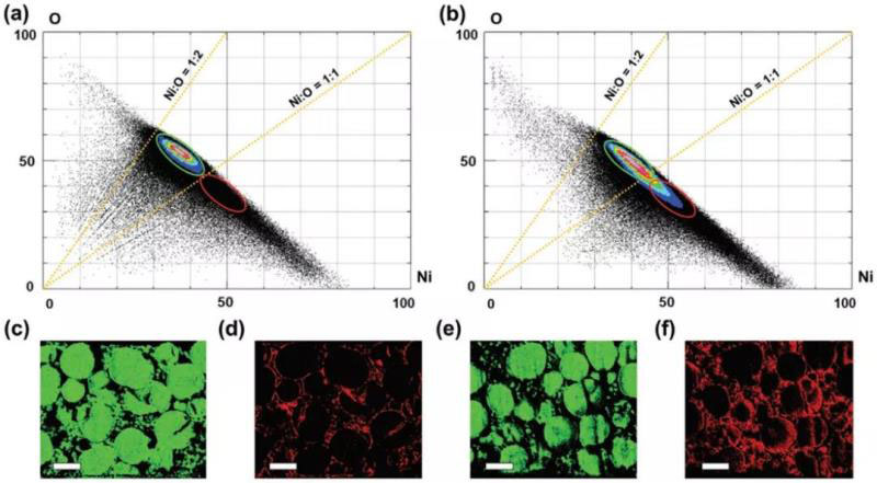 圖3. 電子探針EPMA分析Ni,O元素分布,初始電極和500次循環(huán)后