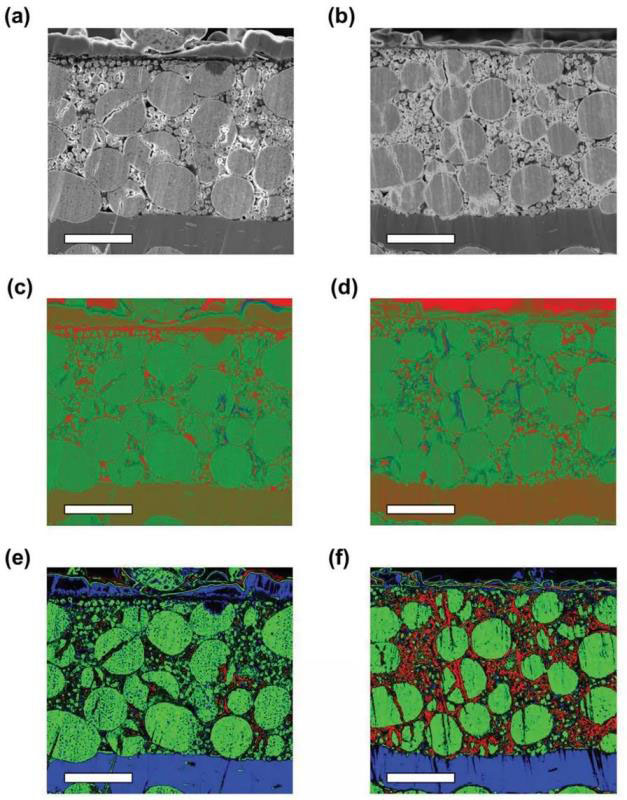 圖2. 電子束感應(yīng)電流法表征微尺度局域電阻特性(以溫度作為對(duì)比),(a,c,e)原始電極,(b,d,f)500次循環(huán)后