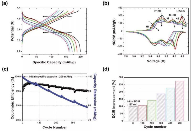 電性能測(cè)試:第2、100、200、300、400和500周期的全電池的充放電曲線(xiàn)逐漸減小,表明極化的增加。對(duì)應(yīng)的差分容量與電壓(dQ / dV)圖峰強(qiáng)度在3.5、3.7和4.2V處變化對(duì)應(yīng)于由于六方相(H1,H2和H3)和單斜相(M)引起的多相轉(zhuǎn)變而導(dǎo)致的正極材料的氧化和還原反應(yīng)峰。原始層狀結(jié)構(gòu)(H1)過(guò)渡到單斜晶相(M)和另外兩個(gè)六角形相(H2和H3),隨著循環(huán)次數(shù)的增加,由于正極材料中不可逆相變的增加,峰強(qiáng)度似乎降低了。最后,循環(huán)過(guò)程中電池容量的下降主要是由極化增加和不可逆的相變引起的。長(zhǎng)循環(huán)和相應(yīng)的庫(kù)倫效率測(cè)試顯示CE從開(kāi)始時(shí)的99.74%下降到結(jié)束時(shí)的99.52%。特別地,隨著充放電的進(jìn)行,內(nèi)阻從127mΩ逐漸增加到275mΩ。該發(fā)現(xiàn)表明,電化學(xué)性能的降低伴隨著電池的結(jié)構(gòu)和化學(xué)組成的變化。