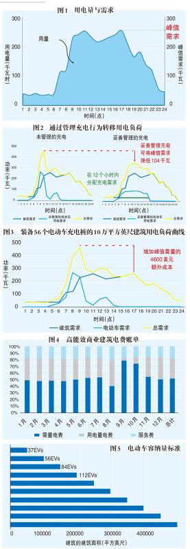 通過(guò)分析科羅拉多州丹佛市一座建筑面積為10萬(wàn)平方英尺(約9290平方米)的建筑用電負(fù)荷分布,我們認(rèn)為在標(biāo)準(zhǔn)辦公/通勤時(shí)間模式下,當(dāng)電動(dòng)車(chē)的數(shù)量超過(guò)56輛,充電負(fù)荷就將會(huì)超過(guò)建筑本身的峰值需求,進(jìn)而觸發(fā)需量電費(fèi)。由于電動(dòng)車(chē)充電與建筑用電高峰(包括供熱、制冷、插座負(fù)荷等)同時(shí)發(fā)生,新的建筑用電需求或總用電需求將會(huì)增加44%,達(dá)到454千瓦,每年增加4600美元的額外成本。
