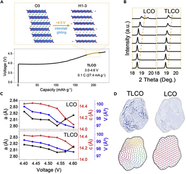 圖4. Ti-Mg-Al摻雜LiCoO2顆粒內(nèi)部缺陷調(diào)控充放電結(jié)構(gòu)相變機制