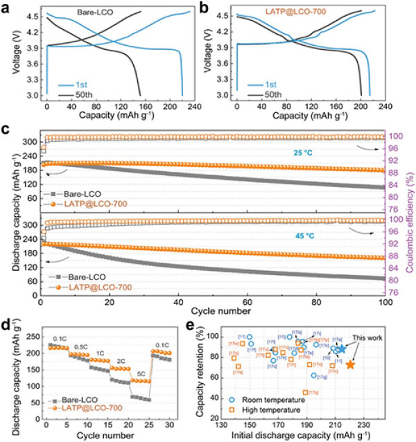 圖2. 未改性和LATP改性LiCoO2材料電化學(xué)性能對比
