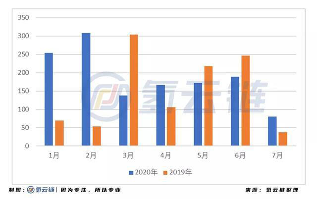 圖1 2019年與2020年1-7月各月投資項(xiàng)目總金額情況對(duì)比(單位:億元) 來源:氫云鏈整理