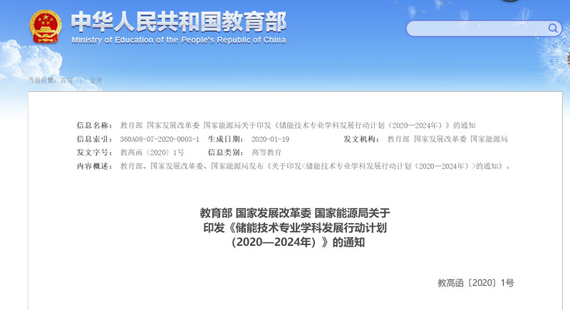 教育部 國(guó)家發(fā)展改革委 國(guó)家能源局關(guān)于印發(fā)《儲(chǔ)能技術(shù)專(zhuān)業(yè)學(xué)科發(fā)展行動(dòng)計(jì)劃(2020—2024年)》的通知