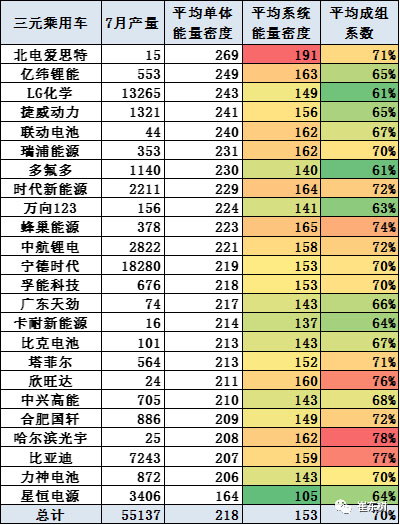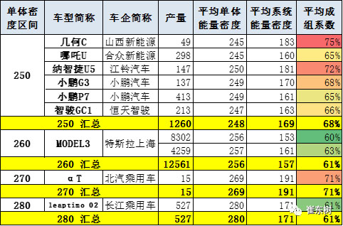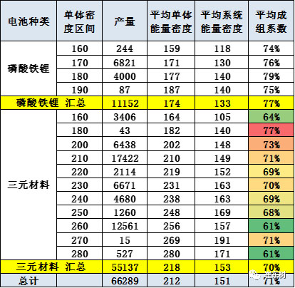乘用車的單體平均密度212瓦時/千克,但成組后是151瓦時/千克,與客車相近,原因是成組率較低,僅有71%。
