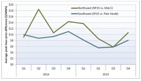 圖3:2014-2015年CAISO市場(NP15區(qū))與美國西北交易中心(Mid-C)和CAISO市場(SP-15區(qū))與西南美國交易中心(SP15區(qū))之間的平均峰時(shí)電價(jià)差異[15]