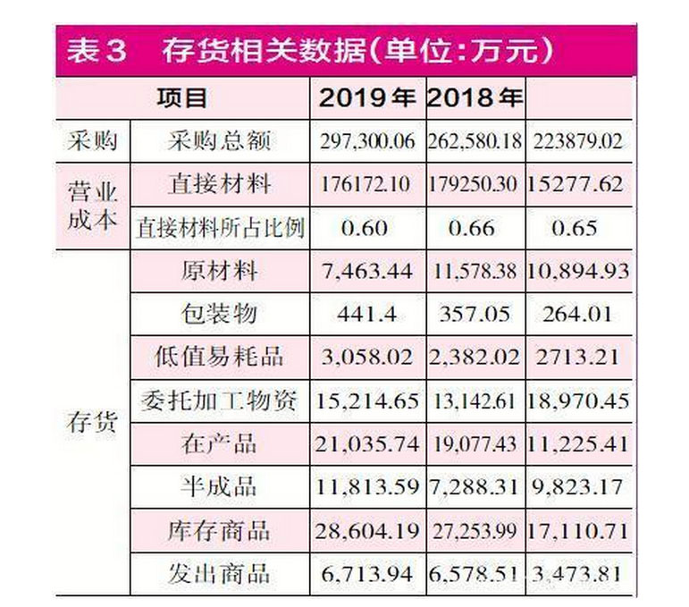 將材料采購金額與營業(yè)成本中消耗的直接材料相減,2018年和2019年分別得到8.33億元和12.11億元的差額,理論上,這部分差額應該計入當期的存貨變化中,即2018年、2019年存貨中的原材料應該分別新增8.33億元和12.11億元。