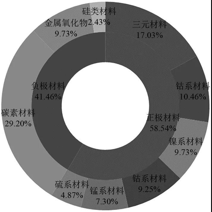 高壓鋰電池依賴于高功率電極材料和高功率電解液,在高功率電極材料中正極材料專利占專利申請總量的58.54%,高于負(fù)極材料的專利申請量,如圖7所示,正極材料中三元材料專利申請所占比例最高,達(dá)到17.03%,三元材料基于其高能量密度等優(yōu)點(diǎn),已經(jīng)成為正極材料研究的熱點(diǎn),其次是鈷系材料,占10.46%。負(fù)極材料專利申請占29.20%,其中碳素材料碳材料具有高比容量,低的電極電位,高的循環(huán)效率,仍然是目前研究熱點(diǎn)和專利申請的重點(diǎn)方向,硅基材料具有較高的能量密度和低的電化學(xué)電勢,近年來也有一定比例的專利申請。