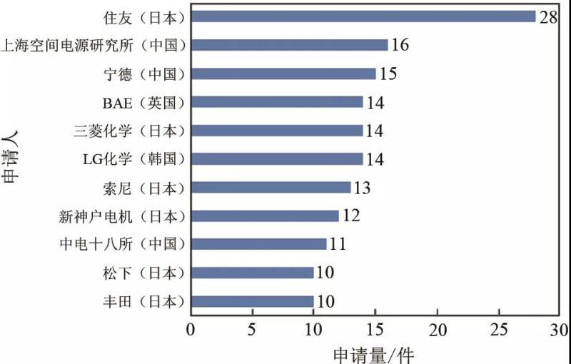 在基礎(chǔ)研究與技術(shù)發(fā)展的支持下,中國的高比特性高壓鋰離子電池技術(shù)已經(jīng)取得了長足的進(jìn)展,重要申請人的數(shù)量僅次于日本[8]。國內(nèi)的上海空間電源研究所和中國電子科技集團(tuán)公司第十八研究所作為軍工企業(yè),在空間電源技術(shù)領(lǐng)域具有先進(jìn)的技術(shù)研發(fā)能力,寧德時代在動力和儲能電池領(lǐng)域,材料、電芯、電池系統(tǒng)等領(lǐng)域已經(jīng)達(dá)到國際先進(jìn)水平。