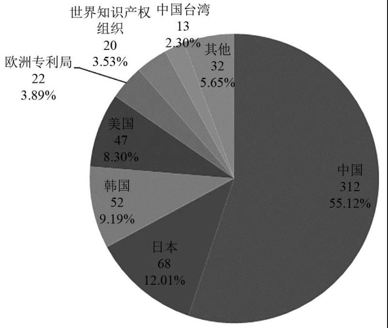 專利申請人除了在本國進(jìn)行專利保護(hù)外,為了在國外生產(chǎn)、銷售產(chǎn)品,專利申請人往往也在國外申請同族專利以求獲得知識產(chǎn)權(quán)保護(hù)。因此,一個國家在特定技術(shù)領(lǐng)域的專利數(shù)量整體上反映了該國在該特定領(lǐng)域的市場前景和競爭程度[6]。通過對高比特性高壓鋰離子電池組技術(shù)領(lǐng)域的專利申請區(qū)域進(jìn)行分析,揭示出各個國家和區(qū)域的技術(shù)實(shí)力和市場前景。圖3對高比特性高壓鋰離子電池組主要的專利申請區(qū)域進(jìn)行了分析,其中中國專利申請量位列第一,有312件專利申請,占專利申請總量的55.12%;日本專利申請量位列第二,表明日本申請人也具有明顯的技術(shù)優(yōu)勢;排在第三位的是韓國,第四位為美國,這是由于韓國在鋰離子電池領(lǐng)域的技術(shù)發(fā)展較快,因此,韓國也成為主要的專利申請國家。