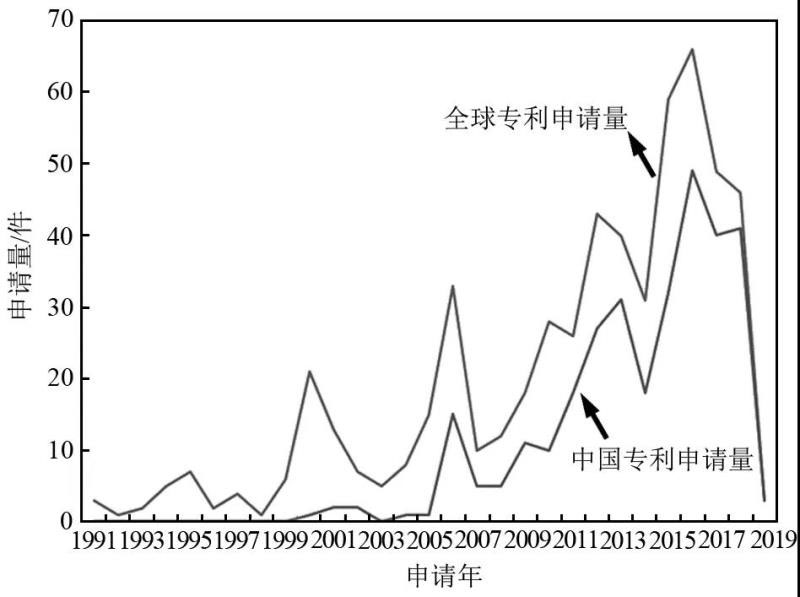 圖1為高比特性高壓鋰離子電池組專利年度申請趨勢,包括全球?qū)@暾堏厔莺椭袊鴮@暾堏厔荩ㄟ^專利申請趨勢能夠反映出高比特性高壓鋰離子電池組受關(guān)注程度以及技術(shù)發(fā)展趨勢。高比特性高壓鋰離子電池組的專利申請趨勢大致經(jīng)歷了3個主要階段。