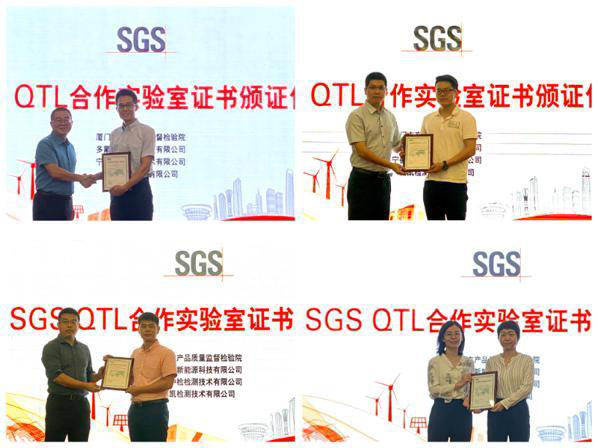 SGS消費(fèi)電子產(chǎn)品事業(yè)部技術(shù)經(jīng)理(左)向廈門市產(chǎn)品質(zhì)量監(jiān)督檢驗(yàn)院、多氟多新能源科技有限公司、寧德中檢檢測技術(shù)有限公司、威凱檢測技術(shù)有限公司(右)頒發(fā)SGS QTL合作實(shí)驗(yàn)室證書