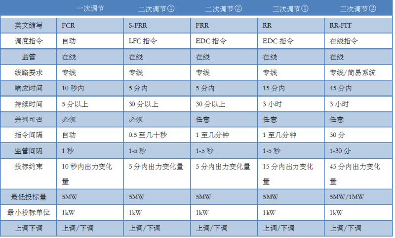 響應(yīng)時間最快的是一次調(diào)節(jié)服務(wù),電網(wǎng)的頻率一旦偏離額定值時,機組的控制系統(tǒng)就會自動地根據(jù)負荷的變化控制機組有功功率的增減,限制電網(wǎng)頻率變化,響應(yīng)時間在10秒以內(nèi),持續(xù)時間5分鐘以上,適用于可變速機組(GF)和可瞬間響應(yīng)的儲能設(shè)備。