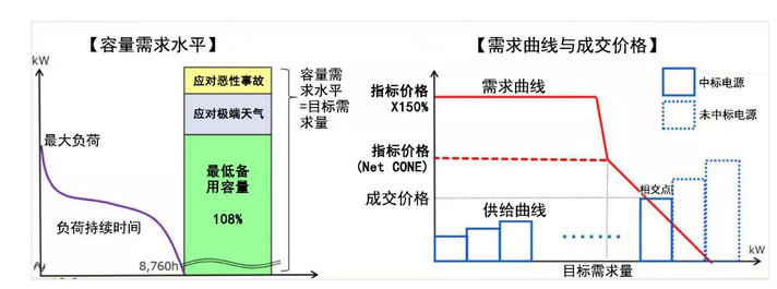 日本容量市場是集中式的容量市場,容量需求和指標價格由OCCTO確定[12]。OCCTO根據(jù)2019年度的供電計劃,目前設(shè)定2024年容量需求為1.8億kW,如圖12(左)所示,容量需求的計算依據(jù)是:系統(tǒng)最低備用容量為H3的8%,應(yīng)對極端天氣的備用容量為H3的2%以及應(yīng)對惡性事故的備用容量為H3的1%。圖12(右)為反映容量價格與容量需求量關(guān)系的曲線,OCCTO以新建機組的投資回收年限設(shè)定指標價格(Net CONE),現(xiàn)為9444日元/kW,競標上限價格不得超過指標價格的150%[13]。OCCTO以容量目標水平為基礎(chǔ)設(shè)定需求曲線,以發(fā)電企業(yè)投標容量形成供給曲線,以投標價格與需求價格的相交點確定成交價格,當?shù)陀谀繕诵枨罅繒r價格急速跳高,當高于需求量時價格緩慢下落,所有交易成功的容量都將按這個價格支付費用。