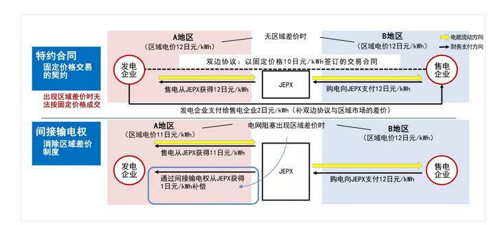 通常輸電權(quán)可以分為物理輸電權(quán)和金融輸電權(quán),分別表現(xiàn)為對于輸電容量的使用權(quán)和收益權(quán)。2019年4月,日本啟動了間接輸電權(quán)交易市場,其中輸電權(quán)是指物理跨區(qū)輸電容量的使用權(quán),輸電權(quán)所有者僅有自己獲得相關(guān)輸電服務(wù)的權(quán)力,不可以轉(zhuǎn)賣,沒有收益權(quán)。間接輸電權(quán)一般是指當電網(wǎng)發(fā)生阻塞時,在現(xiàn)貨批發(fā)市場所約定的電能量范圍內(nèi),交易方有權(quán)要求JEPX支付區(qū)域市場差價的權(quán)利。因此,日本的間接輸電權(quán)可稱為“責任型”輸電權(quán),是分區(qū)電價結(jié)算差價的一種契約,而非歐美國家的權(quán)益型輸電權(quán)[10]。