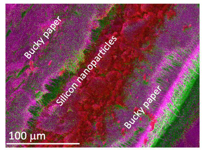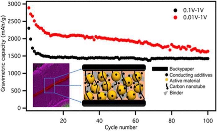 該研究的第一作者 Shailendra Chiluwal 表示:“獨(dú)立的碳納米管片使硅納米粒子之間保持電連接、這些納米管形成了一個(gè)準(zhǔn)三維結(jié)構(gòu),即使在500次循環(huán)之后,也能將硅納米粒子保持在一起,并減輕了納米粒子破裂所產(chǎn)生的電阻”。
