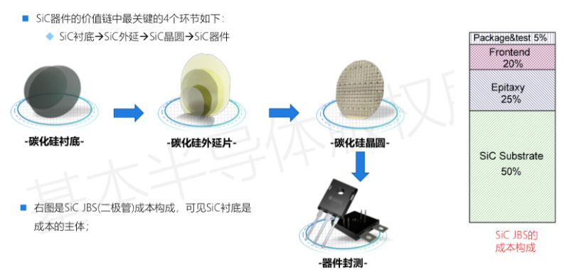 與集成電路所采用的先進(jìn)工藝不同,功率器件對于線寬等沒有特別苛刻的要求,SiC器件的制備難點主要在于襯底和外延環(huán)節(jié),這一點從成本上也能看出來。