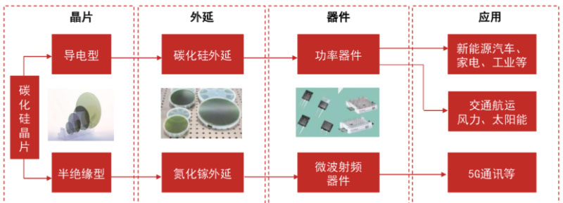 碳化硅根據(jù)電阻率不同有兩種襯底類型:導(dǎo)電型襯底、半絕緣型襯底,可以分別用于功率和射頻領(lǐng)域。如果是導(dǎo)電型襯底,在制備碳化硅外延后,可加工成功率器件,用于新能源汽車、風(fēng)電、光伏等領(lǐng)域;如果是半絕緣型襯底,配合GaN外延,可以制備射頻器件,用于5G等領(lǐng)域。