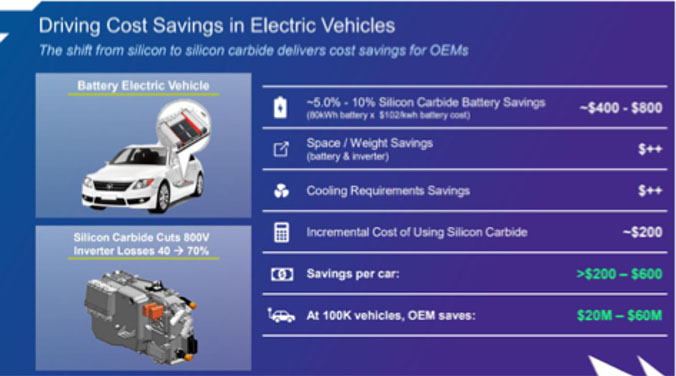 按照一塊80kwh的電池計算,102美元/kWh的電池成本下,使用SiC逆變器相當(dāng)于節(jié)省了400-800美元的電池成本,與新增200美元的SiC器件成本抵消后,整體上實現(xiàn)了200美元的單車降本。