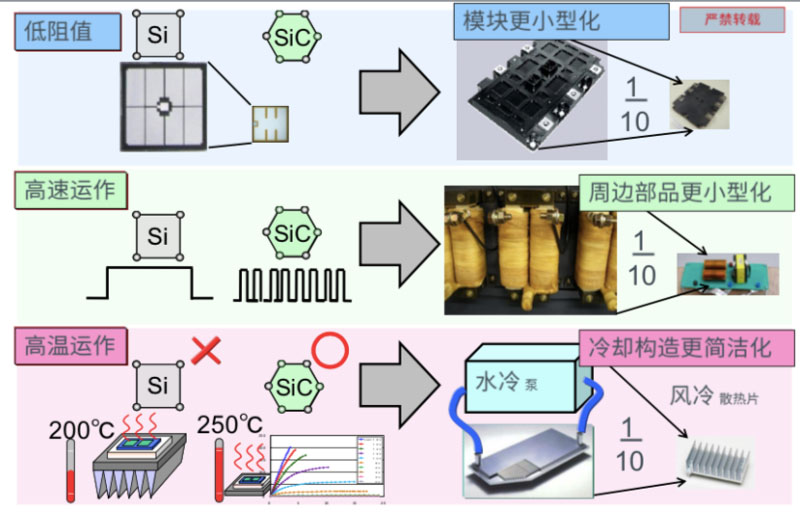 在器件層面,根據(jù)半導(dǎo)體廠商羅姆的總結(jié),SiC器件相對于Si器件的主要優(yōu)勢來自三個方面: