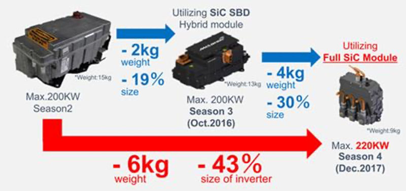 2017年的第四賽季時,賽車使用了SiC MOSFET和SiC SBD組成的全SiC功率模塊之后,重量降低至9kg,體積相對于最初降低了43%。