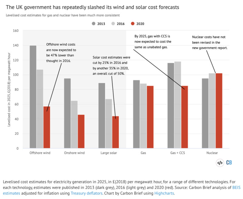 BEIS的最新報(bào)告預(yù)計(jì)未來天然氣發(fā)電的平準(zhǔn)成本僅小幅下降,2025年陸上風(fēng)能和太陽能的成本將是天然氣的一半。相比之下,新的報(bào)告沒有修改早先對(duì)核電成本的估計(jì)。
