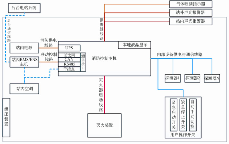 內(nèi)置UPS不間斷電源,保證站內(nèi)斷電情況下,持續(xù)工作時(shí)間不小于2小時(shí)),由消防主機(jī)提供并管理系統(tǒng)內(nèi)所有設(shè)備的電源,實(shí)時(shí)顯示站內(nèi)探測(cè)器采集數(shù)據(jù)與火災(zāi)報(bào)警信號(hào)歷史數(shù)據(jù)查詢,并導(dǎo)出報(bào)表,負(fù)責(zé)消防系統(tǒng)的聯(lián)動(dòng)控制。至少提供以太網(wǎng)、CAN、RS485、干接點(diǎn)4類通信接口,滿足常用的組網(wǎng)通信方式。