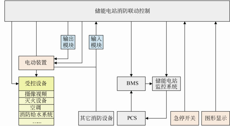 本系統(tǒng)中的儲(chǔ)能電站消防預(yù)警系統(tǒng)的聯(lián)動(dòng)控制策略主要基于兩方面,一是如何快速有效地檢測(cè)出電池的熱事故隱患和熱失控狀態(tài);二是在出現(xiàn)熱失控的狀態(tài)下如何快速啟動(dòng)消防設(shè)施,實(shí)現(xiàn)有效滅火。針對(duì)大規(guī)模儲(chǔ)能電池結(jié)構(gòu)復(fù)雜、規(guī)模大等特點(diǎn),結(jié)合儲(chǔ)能站內(nèi)消防、動(dòng)環(huán)等系統(tǒng)的運(yùn)行特點(diǎn),采用分層管理的系統(tǒng)整體結(jié)構(gòu),實(shí)現(xiàn)消防系統(tǒng)、電池管理系統(tǒng)、動(dòng)環(huán)系統(tǒng)等的深度融合,實(shí)現(xiàn)多系統(tǒng)聯(lián)動(dòng)設(shè)計(jì),確保儲(chǔ)能系統(tǒng)的安全。