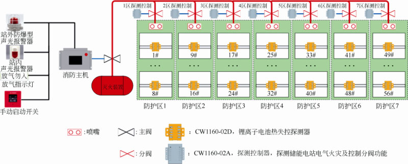 消防系統(tǒng)由熱失控探測(cè)器、消防控制主機(jī)、緊急啟停開關(guān)、聲光報(bào)警器、滅火裝置等部件組成。