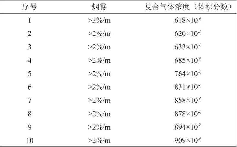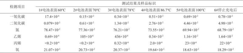 結(jié)合探測(cè)數(shù)據(jù)的圖表可以看出,鋰電池在防爆閥打開后并且熱失控發(fā)生前,產(chǎn)生大量的氣體和煙霧,并迅速超出了復(fù)合氣體傳感器的測(cè)量量程(體積分?jǐn)?shù))1000×10-6,具體數(shù)值參考表1。
