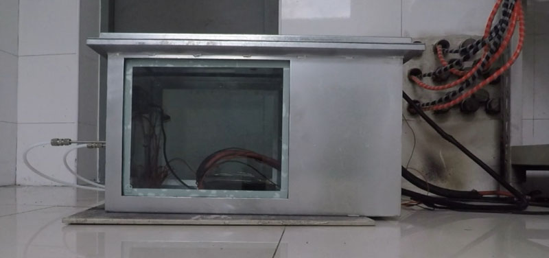 (2)試驗(yàn)過程當(dāng)電池表面溫度達(dá)到58.7 ℃時(shí),電池箱內(nèi)置傳感器的氣敏傳感器檢測(cè)出CO氣體并且濃度開始逐漸上升,通過觀察窗可以看到電池發(fā)生了輕微鼓包,此時(shí)電池表面溫度為58.7 ℃,一氧化碳濃度為(體積分?jǐn)?shù))20×10-6。試驗(yàn)布置圖如圖5所示。