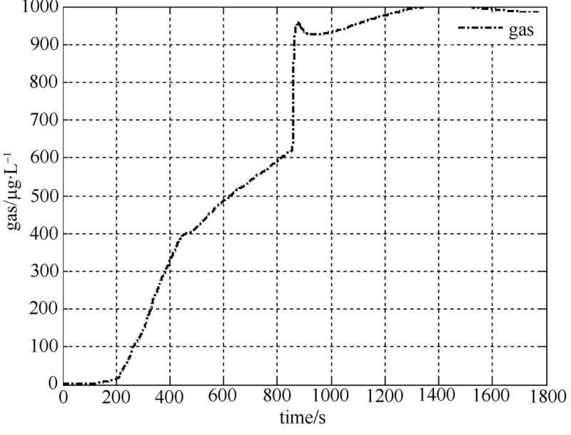 (2)試驗(yàn)判定本次試驗(yàn)中,電池材料受到加熱片加熱,產(chǎn)生氣體,復(fù)合氣體傳感器采集的氣體濃度呈平滑增長(zhǎng)狀態(tài);鋰電池的泄壓閥在爆開后,復(fù)合氣體傳感器探測(cè)到的氣體濃度呈明顯上升狀態(tài),參考圖4。由此可以確認(rèn),可以使用某類氣體作為鋰電池?zé)崾Э卦缙陬A(yù)警的判斷依據(jù),該類氣體滿足以下條件:① 非空氣主要的構(gòu)成氣體;② 有相應(yīng)氣體傳感器對(duì)其進(jìn)行定量檢測(cè);③ 電池防爆閥在打開前、后,該類氣體濃度有明顯對(duì)比。